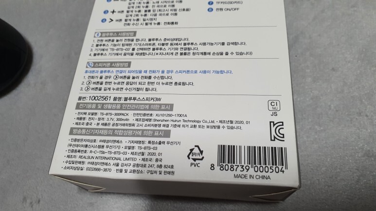 이번 스피커는 설명서가 제공되지 않는다. 대신 패키지 후면부에 사용법과 제품 정보 등에 대해 기재를 해 놓았다. 사실 간략한 내용만 기재되어 있는 설명서를 별도에 첨부해 넣는 경우 대부분 패키지를 뜯으면서 바로 버리기 때문에, 나중에 기능을 사용할 때 모르는 부분이 있으면 헤맬 때가 많은데, 아예 이렇게 시원시원하게 조작법에 관해서 패키지에 쉽게 알아볼 수 있도록 한 점은 칭찬할 만 하다. 다만 주의할 점과 재생 지원 정보도 같이 기재를 해주면 좋지 않았나 싶다.